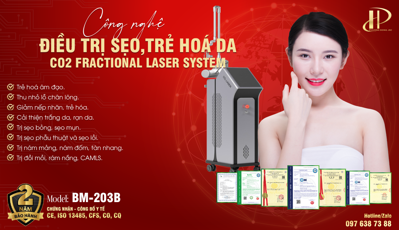 Máy điều trị sẹo,trẻ hoá da CO2 FRACTIONAL LASER SYSTEM BM-203B sử dụng tia Laser Co2 có bước sóng 10.600 nm có khả năng tác động sâu vào lớp hạ bì mà không gây xâm lấn vùng da lành xung quanh, tạo những đường dẫn để đưa yếu tố tăng trưởng vào sâu bên trong da để kích thích tăng sinh collagen làm đầy sẹo. Đồng thời tác dụng nhiệt của Laser Fractional Co2 cũng kích thích tái tạo lớp collagen nằm sâu bên dưới da, làm đầy sẹo lõm vượt trội.