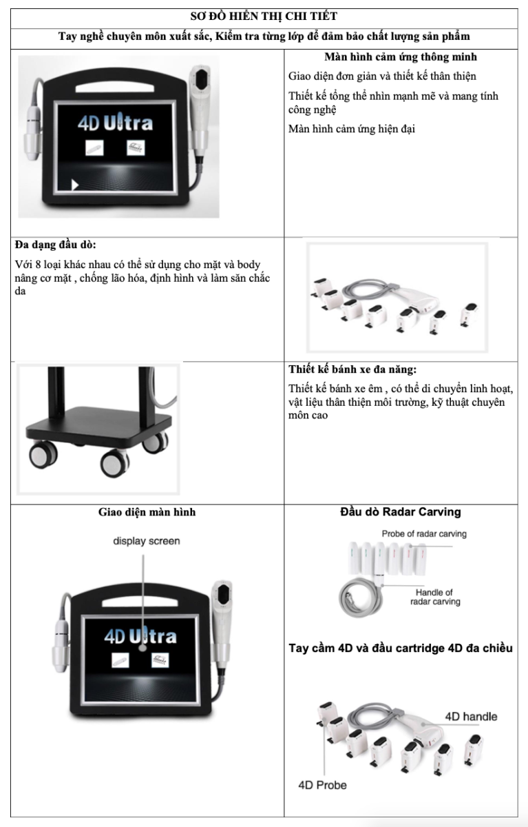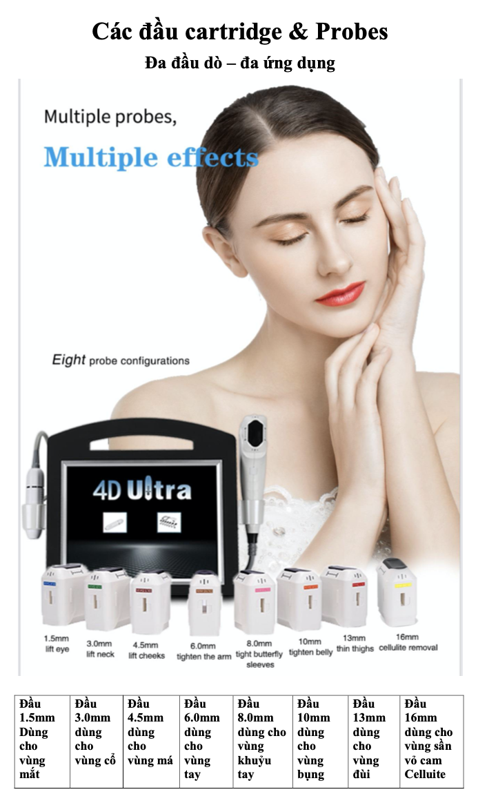 Sự kết hợp giữa Hifu vi điểm (Radar carving) và Hifu 4D multi-line (Line carving). Radar Carving có tốc độ nhanh hơn, năng lượng tốt hơn và hiệu ứng đồng nhất, và tại sao chúng tôi đặt tuổi thọ là 60.000 shots cho mỗi đầu dò? Bởi vì mỗi chip năng lượng hội tụ sóng siêu âm sẽ có tuổi thọ khoảng 60.000 shots, nếu trên 60.000 shots, năng lượng của sẽ bị yếu, giảm hiệu quả của trị liệu.
