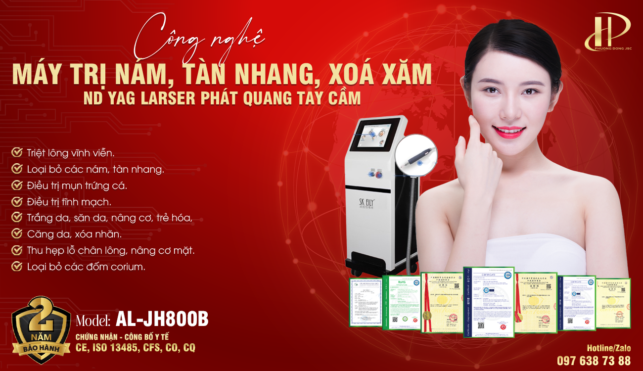 Máy trị nám tàn nhang ND YAG Laser AL-JH800B chuyên xóa các hình xăm, Laser phát ra ánh sáng có bước sóng chọn lọc và siêu ngắn tính bằng nano giây, có khả năng thâm nhập mạnh mẽ cho phép nó đạt đến lớp sâu của lớp hạ bì. Các hạt sắc tố hấp thụ năng lượng ánh sáng và phát nổ nhanh, vỡ thành những mảnh nhỏ, do đó làm giảm mật độ màu và một phần được đẩy ra bên ngoài bề mặt da và phần còn lại được loại bỏ ra ngoài cơ thể qua hệ thống bài tiết. Cho nên thiết bị này có thể loại bỏ hiệu quả các sắc tố đột biến và các mô mạch dựa trên các mô xung quanh không bị hư hại. Đây được gọi là nguyên lý ‘Thu hẹp nhiệt’ trong lĩnh vực y tế.