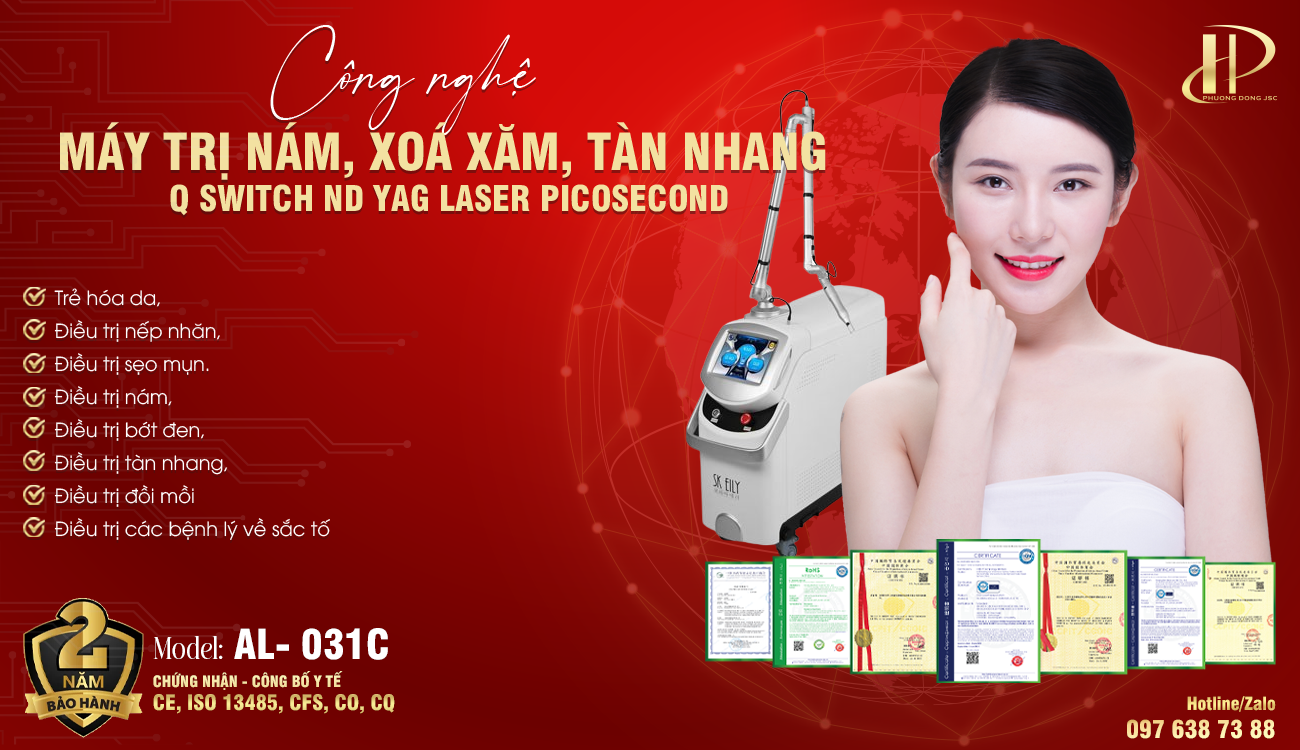 Máy trị nám tàn nhang Q SWITCH ND YAG LASER AL-031C là công nghệ Q SWITCH mới nhất có 03 bước sóng 1064nm, 532nm và 755nm. AL- 031C là dòng máy ND YAG Laser trục khuỷu sử dụng công nghệ Picosecond (Công nghệ Pico giây) chuyên điều trị sắc tố như các bệnh lý về nám, xóa các hình xăm.