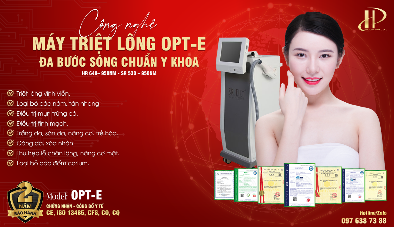 Máy triệt lông OPT-E đại diện cho thế hệ thiết bị thẩm mỹ sử dụng công nghệ ánh sáng tiên tiến nhất hiện nay là OPT (Optimal Pulse Technology). Đây là giải pháp hoàn hảo để triệt sạch lông, mang lại làn da mịn màng, đồng thời cải thiện chất lượng da một cách rõ rệt. Là thiết bị được CÔNG TY THIẾT BỊ THẨM MỸ PHƯƠNG ĐÔNG nhập khẩu chính hãng và độc quyền tại thị trường Việt Nam, đã qua quy trình kiểm tra chất lượng nghiêm ngặt, đảm bảo hiệu suất hoạt động ổn định và an toàn tuyệt đối.
