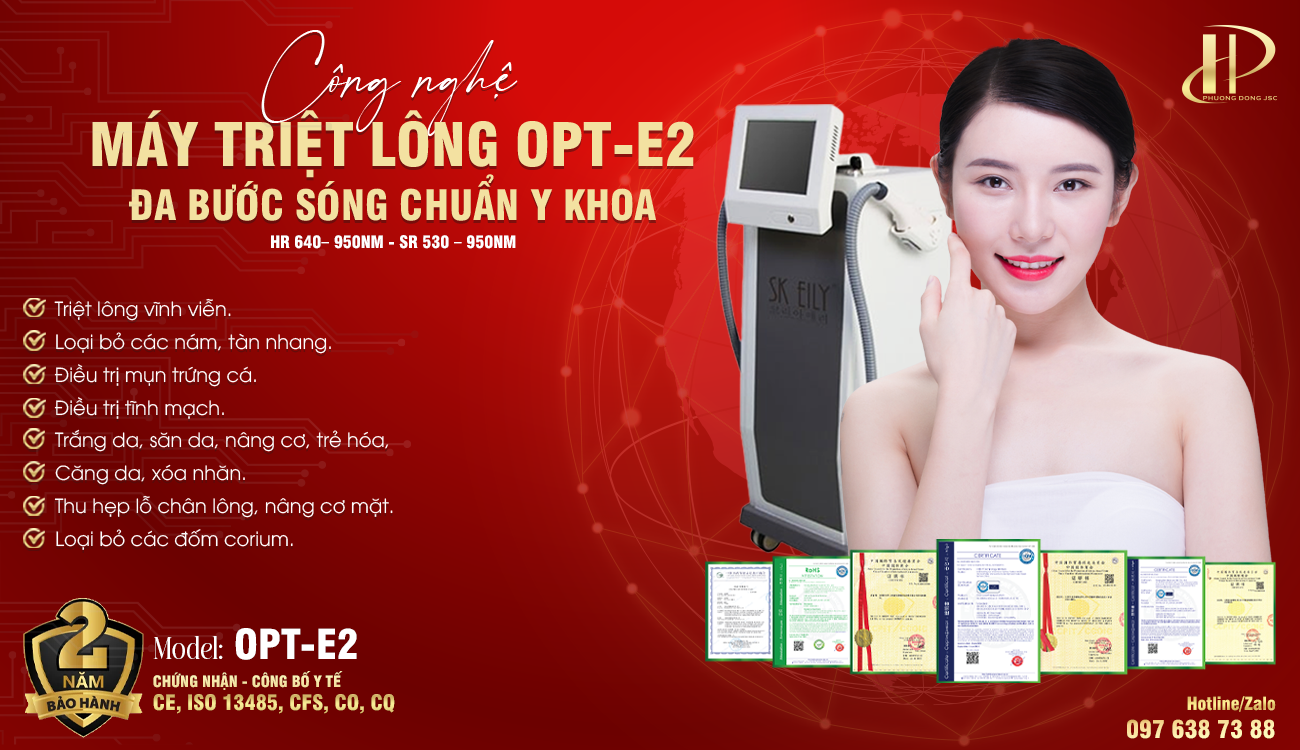 Máy triệt lông OPT-E2 đại diện cho thế hệ thiết bị thẩm mỹ sử dụng công nghệ ánh sáng tiên tiến nhất hiện nay là OPT (Optimal Pulse Technology). Đây là giải pháp hoàn hảo để triệt sạch lông, mang lại làn da mịn màng, đồng thời cải thiện chất lượng da một cách rõ rệt. Là thiết bị được CÔNG TY THIẾT BỊ THẨM MỸ PHƯƠNG ĐÔNG nhập khẩu chính hãng và độc quyền tại thị trường Việt Nam, đã qua quy trình kiểm tra chất lượng nghiêm ngặt, đảm bảo hiệu suất hoạt động ổn định và an toàn tuyệt đối.